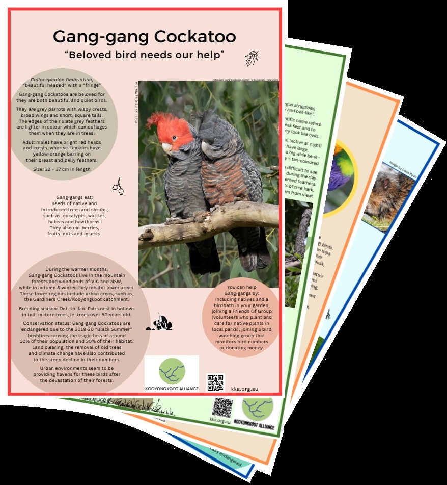 Developed by Vicki Scrivenger and Graham Ross, these posters feature: the Rakali, Rainbow Lorikeet, Tawny Frogmouth and Gang-gang Cockatoo – celebrating some of our most distinctive local wildlife and inviting visitors to pause, learn and connect with Nature. Many details in the Tawny Frogmouth poster were contributed by R. Ault and a number of the photos chosen for the series were taken by Ian Moodie.