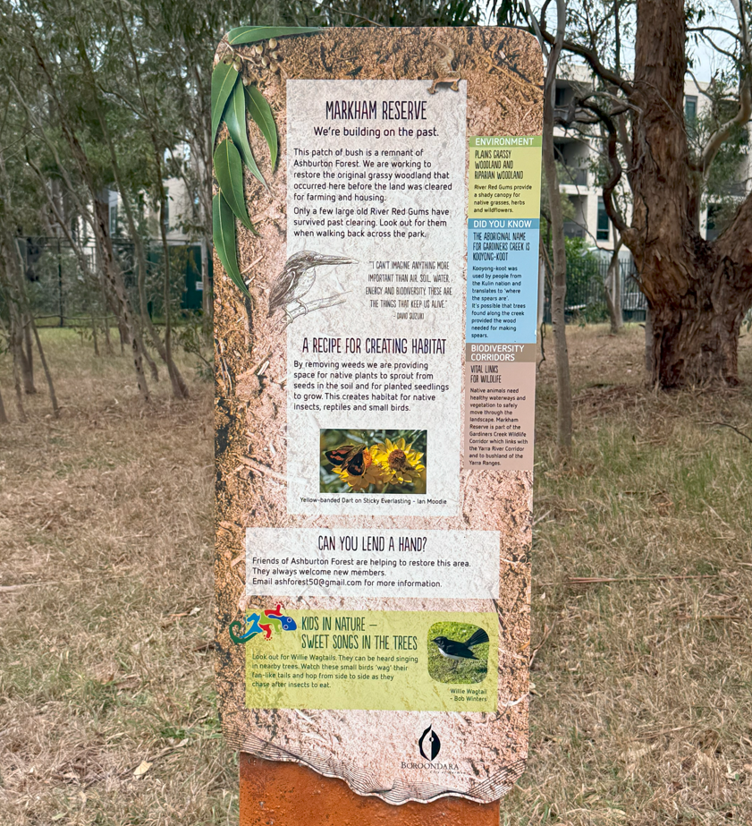 Markham Forest covers the forested areas near Gardiners (KooyongKoot) Creek, along the south of Markham Avenue Reserve in Ashburton. It includes the areas planted under a 2022 Queen’s Platinum Jubilee federal grant which are located at the eastern and western ends of the reserve. Our projects page for Markham Forest shows some of the history and future plans.